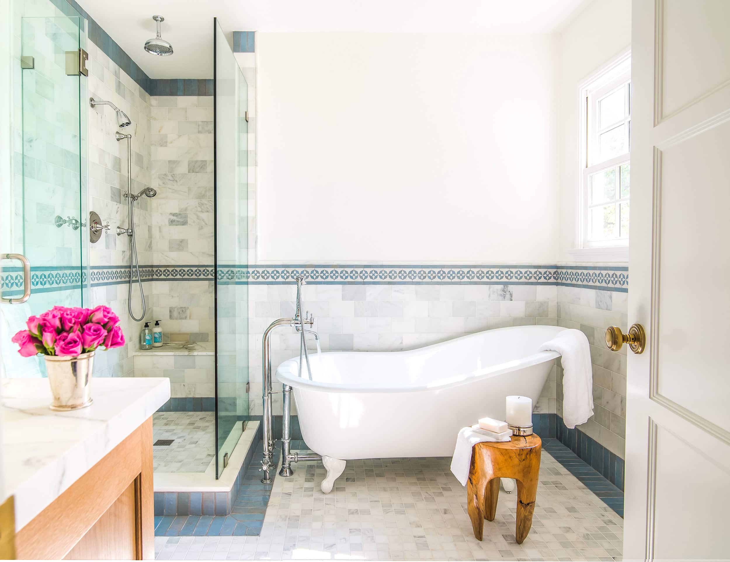 - Moroccan tile, antique limestone pavers, and river pebble finishes in guest bathrooms