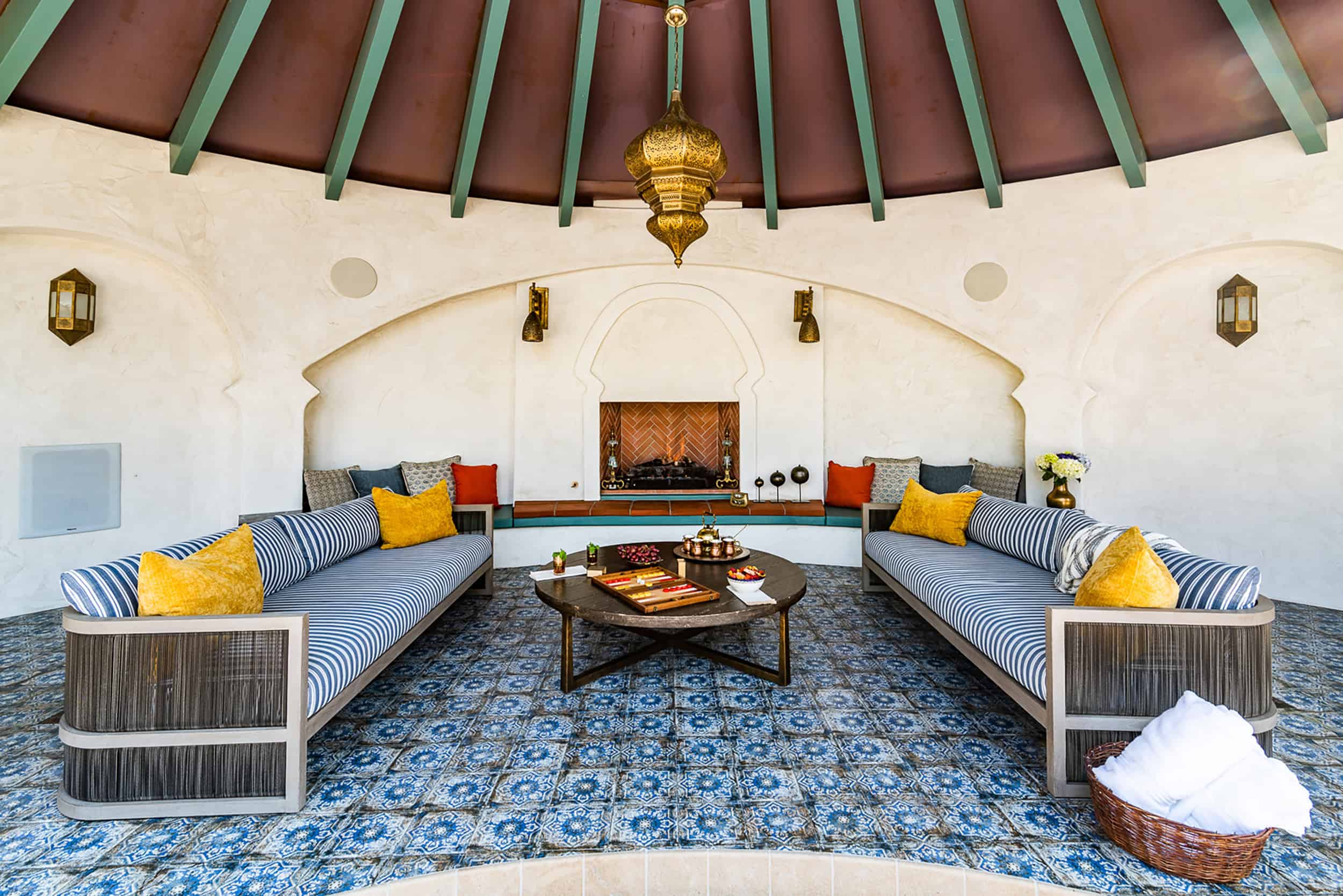 - Patterned terracotta pavers and decorative glazed tiles across outdoor spaces