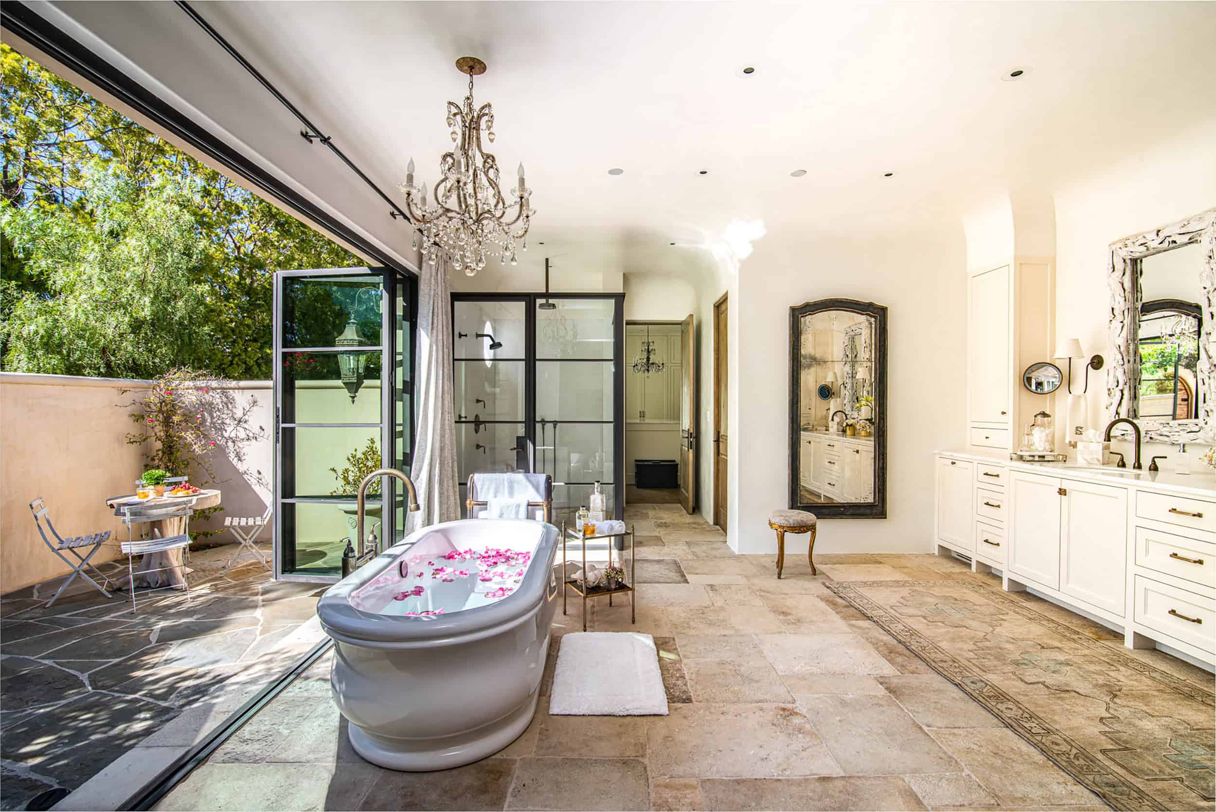 - Moroccan tile, antique limestone pavers, and river pebble finishes in guest bathrooms