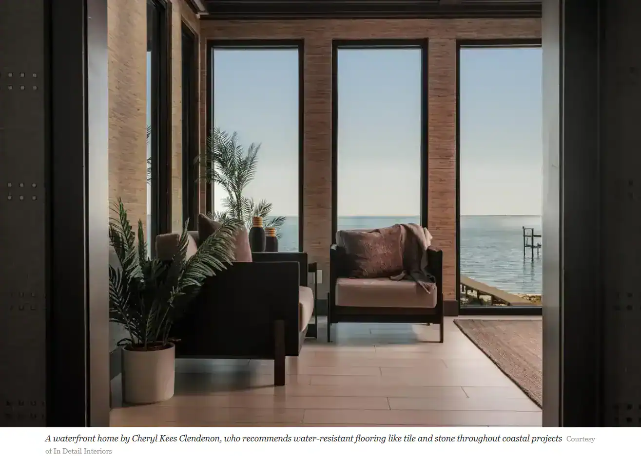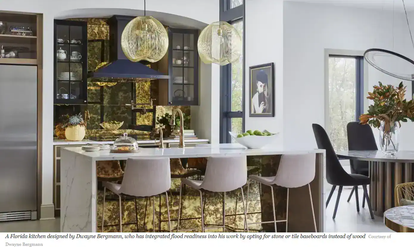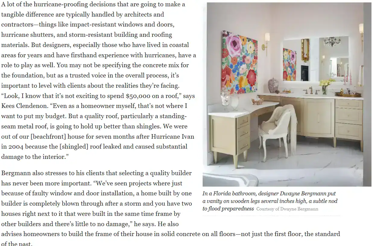 Hurricane Winds and FloodsIn the Sunshine State, hurricanes are not a matter of if, but when. As rising ocean temperatures contribute to stronger storm systems, designers across the state are adopting a more proactive approach. A lot of that thinking comes down to material selection. Wall-to-wall carpeting, for example, is a hard pass for most coastal designers, as any flooding is going to render the material a soggy, moldy mess. Cheryl Kees Clendenon, a designer based in Pensacola, says that she often has to educate clients—particularly those from out of state—on the trade-offs they’ll need to make to accommodate the region’s unique conditions. “We had clients from Washington state who bought a home [here] that was a bit removed from the coastline, but we had to explain to them that [even though] it’s not a waterfront property, you still have risks to consider,” says Kees Clendenon. “We talk to our clients not just about why we’re picking certain materials, but how those materials might hold up if they get wet.”