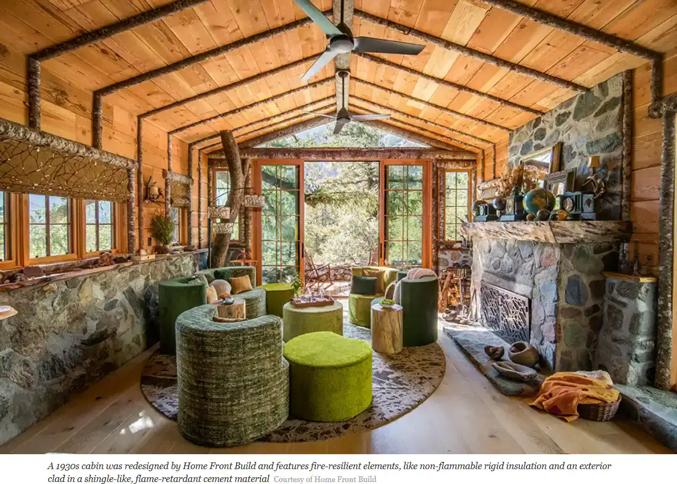 In areas prone to wildfires, another area that designers have sway over is the landscaping. Features like wooden fences are a bad idea, as they are combustible, much like trees and shrubs. Pallrand says that major foliage should be sited at least 50 to 100 feet away from a house in a fire hazard area. “Our homes and commercial spaces are more resilient with today’s building codes, at least in California, but the landscaping is not, and that is a very critical part of the resilience puzzle,” he says. Hayslett recommends that clients take seemingly small measures in their landscaping and exterior living spaces, like putting a tiled or stucco half-wall around a patio, or creating a stone barrier between plant beds and the rest of the yard—both elements that would ideally slow a fire before it could reach the house. “Even a little bit of a concrete barrier can be beneficial,” she says.