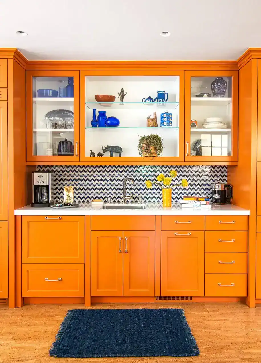 And it’s cheery, too. “The bright orange cabinetry is a wonderful balance to Mary’s love of blue,” Karimi says, noting the blue and white zigzag tile backsplash that packs a graphic punch.